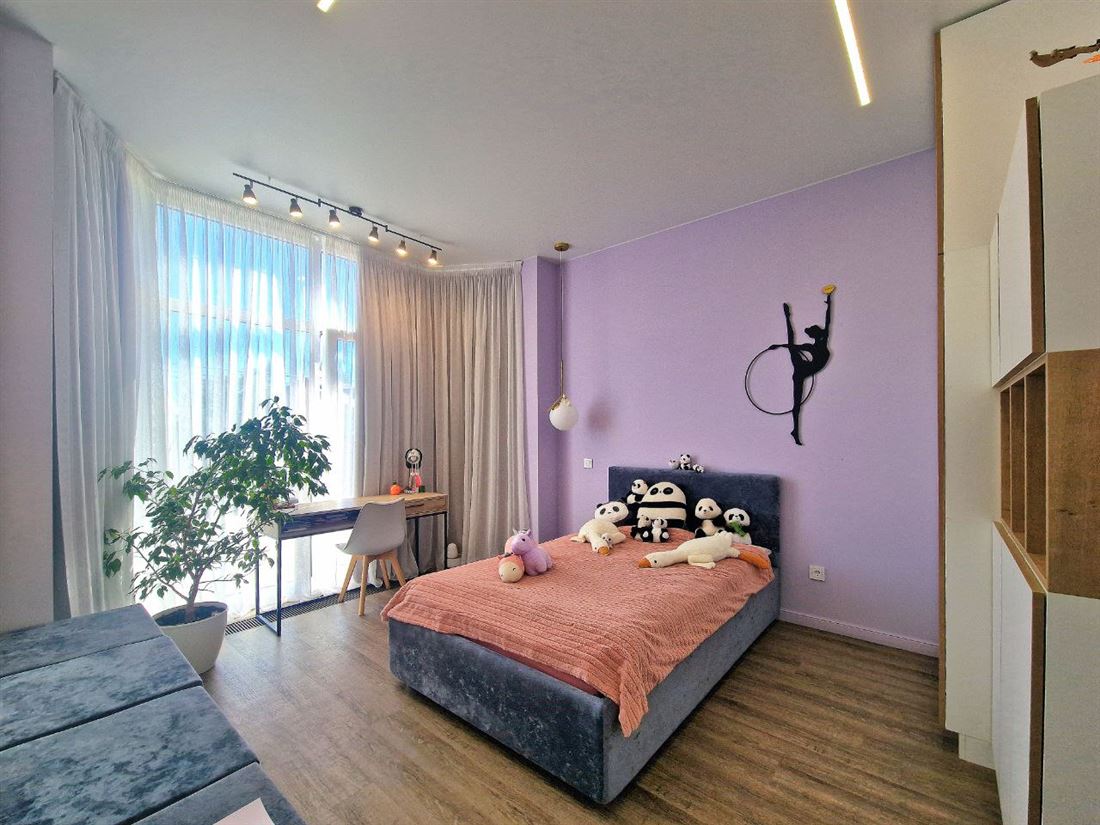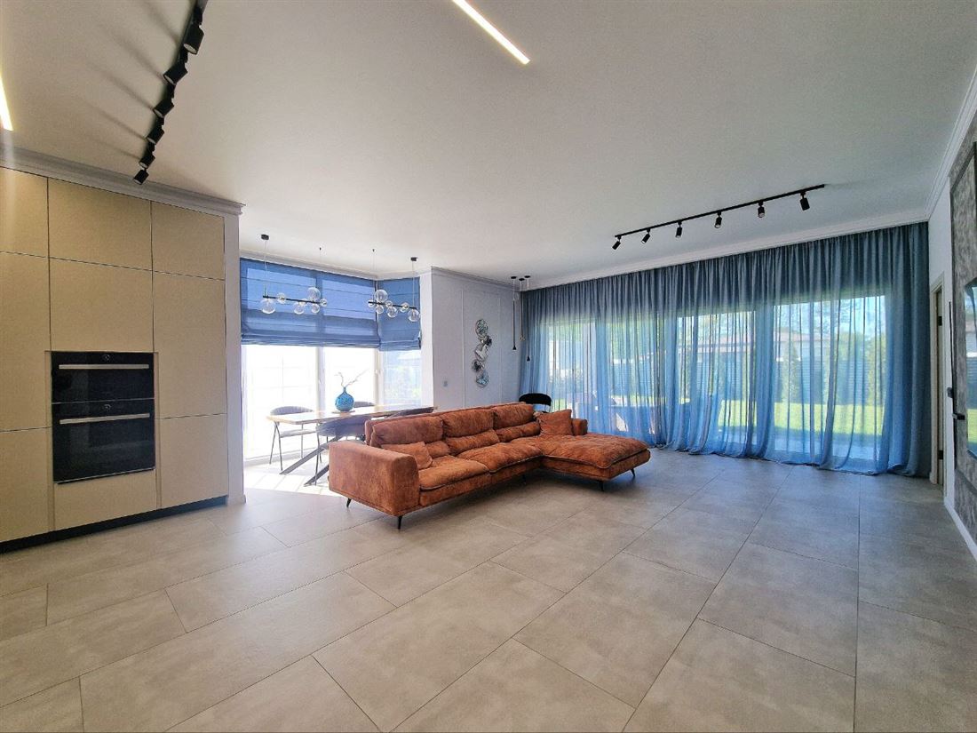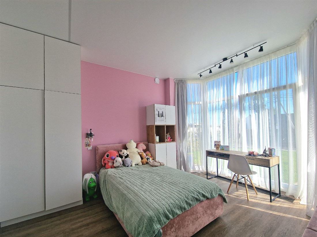 2 комнаты для детей, кабинет, главная спальня со своим санузлом, просторная гостиная с кухонной зоной и крытая терраса с прекрасным газоном и озеленением.
