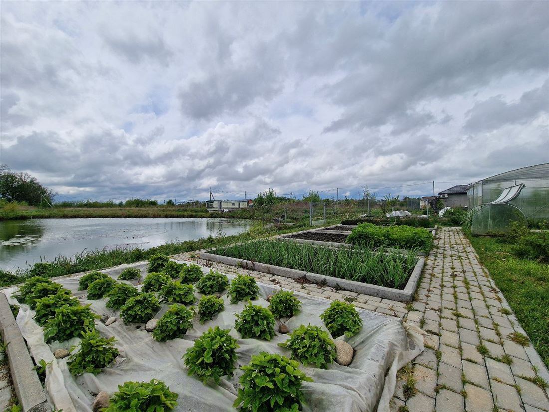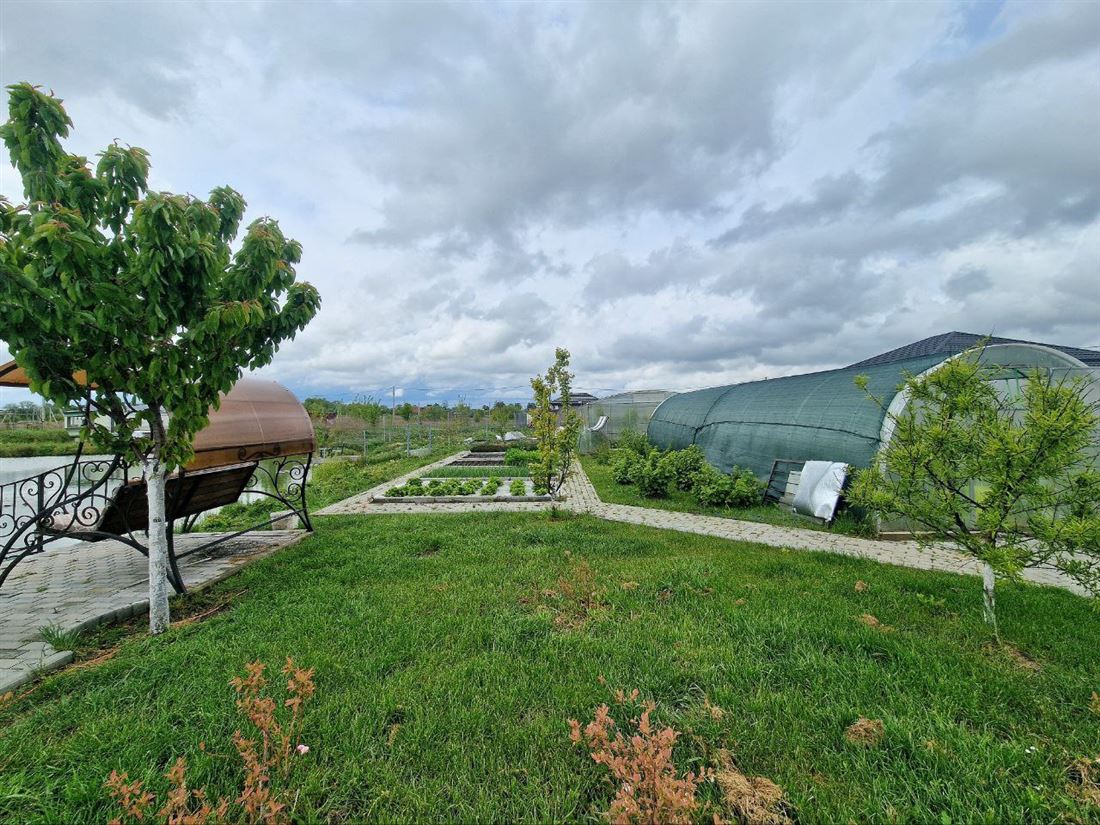 Большая благоустроенная территория с большим количеством садовых растений и кустарников, теплица 12 метров, грядки под различные сельхозкультуры.