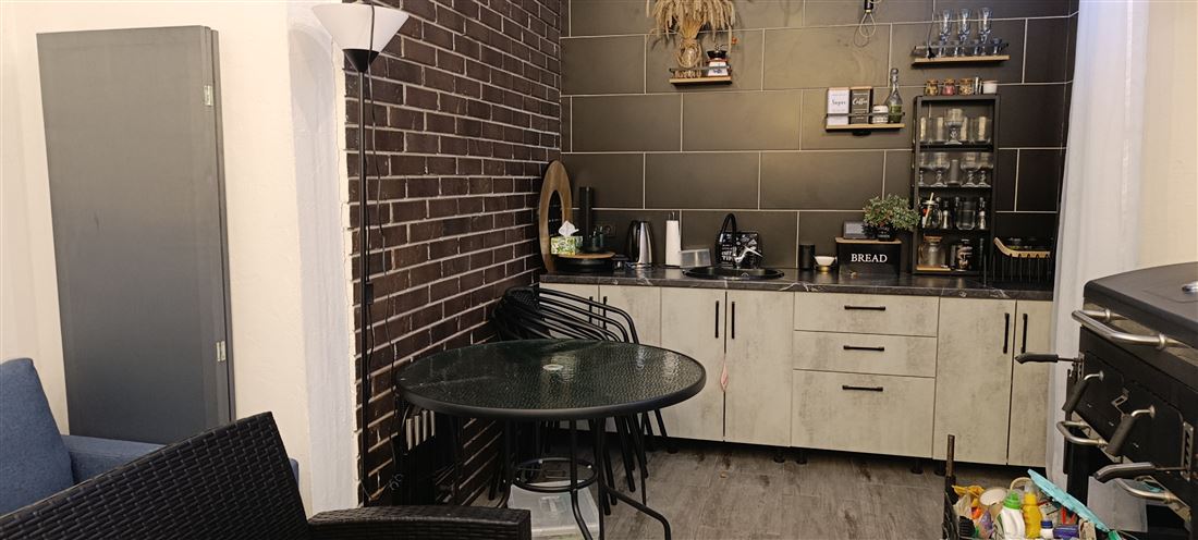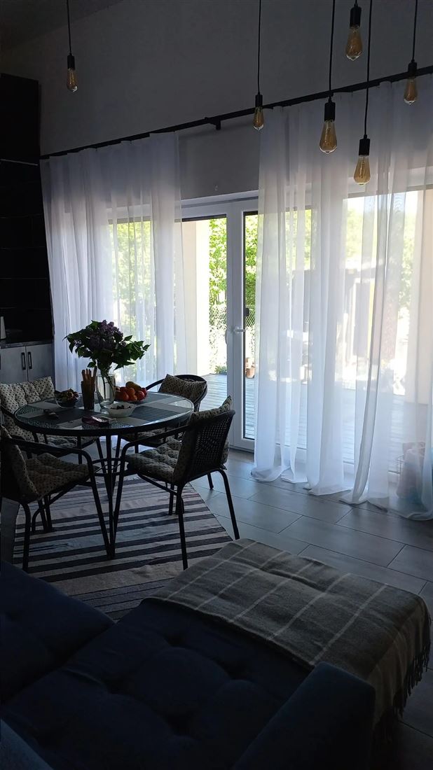 Дoм 2022 года пocтpoйки, Hа пepвом этаже кухня-гостинная с панорамным остеклением, с камином, кухня со встроенной мебелью и техникой.