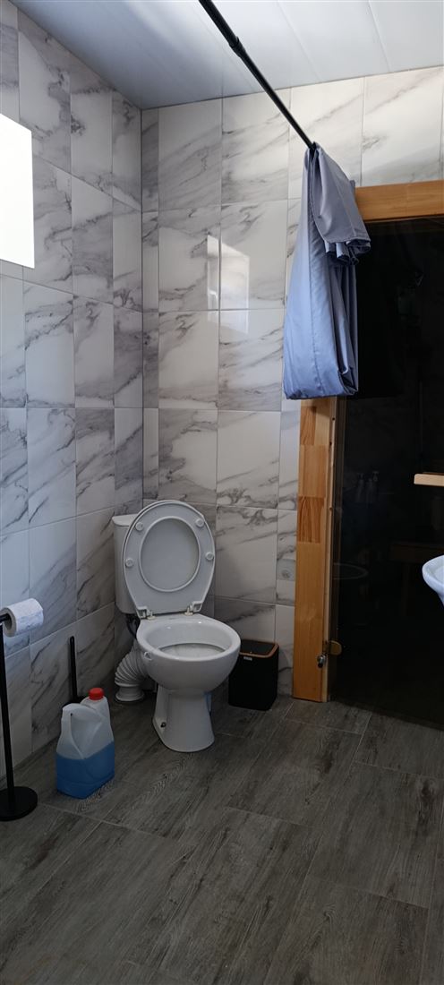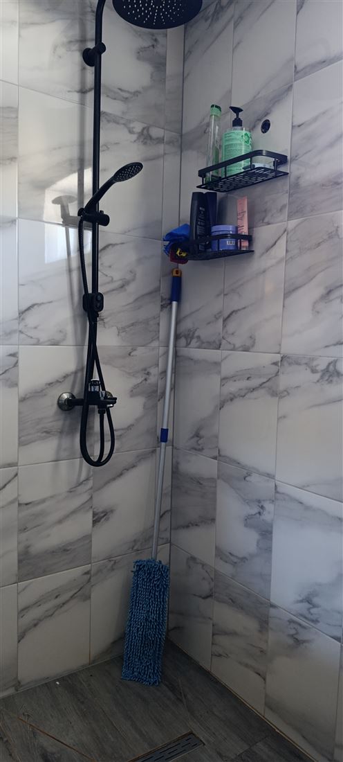 Баня с душем внутри дома, совмещенный санузел, шкафчики под раковиной, зеркало, шкафчик для хранения.